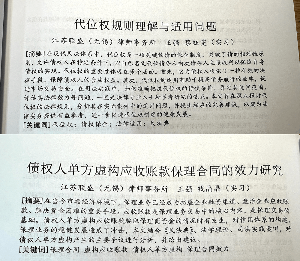 江苏联盛(无锡)律师事务所刑事团队的实习人员蔡钰雯、钱晶晶积极参与此次研讨会,撰写的论文《代位权规则理解与适用问题》及《债权人单方虚构应收账款保理合同的效力研究》成功收录于本次研讨会的《论文集》。尽管两位实习人员的工作领域主要集中于刑事案件,但她们在本次研讨中展现了对民商事法律的深入思考,展示了跨领域法律工作的潜力。