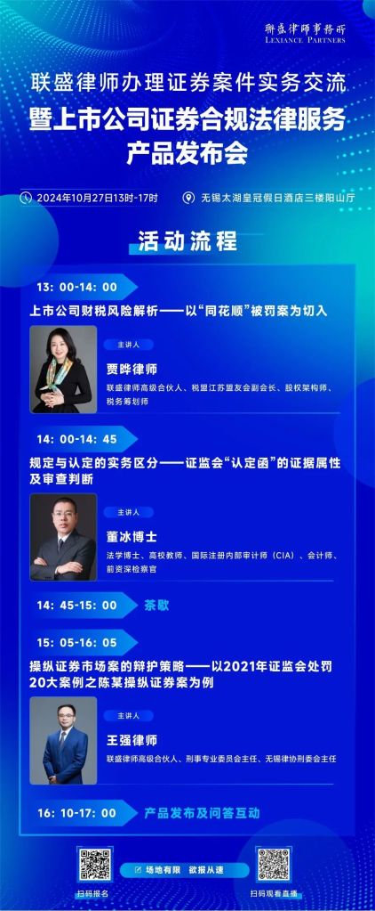 我们荣邀您参加联盛律师办理证券案件实务交流暨上市公司证券合规法律服务产品发布会,这不仅是一场知识的盛宴,更是一个行业精英的交流平台。