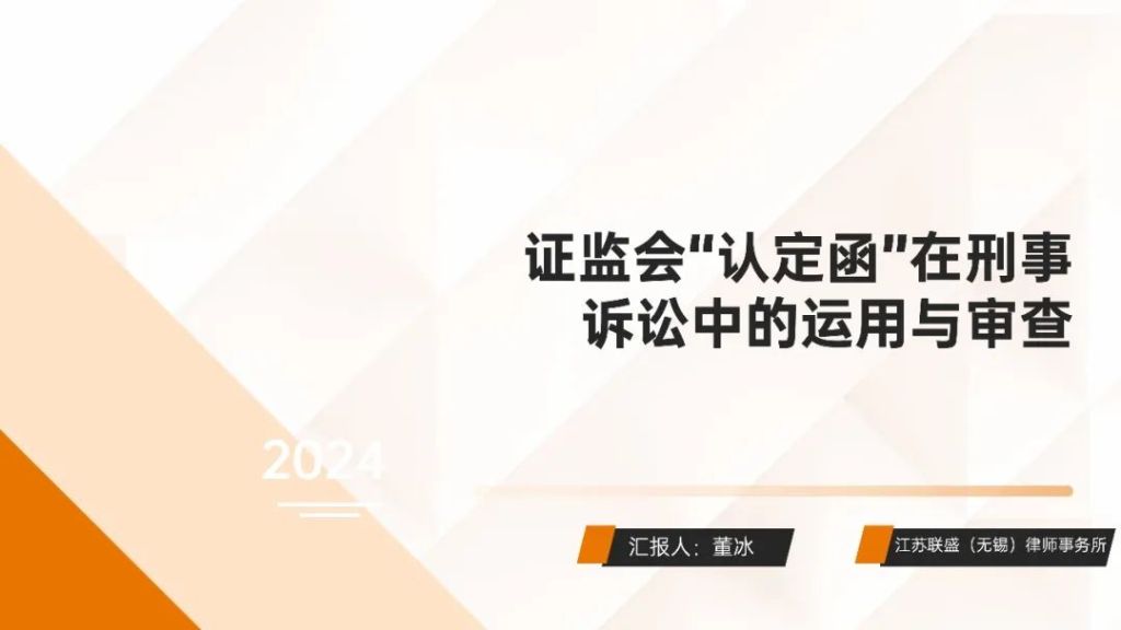 2. 证监会“认定函”在刑事诉讼中的应用与审查高校教师、国际注册内部审计师、会计师、前资深检察官、法学博士董冰带来了一场关于证监会“认定函”属性和应用的精彩解读。他不仅深入剖析了“认定函”的重要性及法院不同情况下的采信方式,还提供了丰富的案例来展示如何在证券案件中将其作为辅助证据使用。这一议题为律师、法务人员提供了实务操作上的宝贵参考,也让大家更直观地理解了“认定函”在证券市场违规案件中的应用。