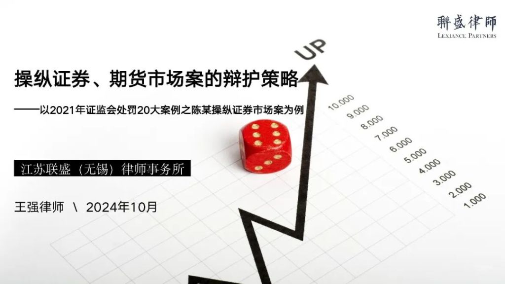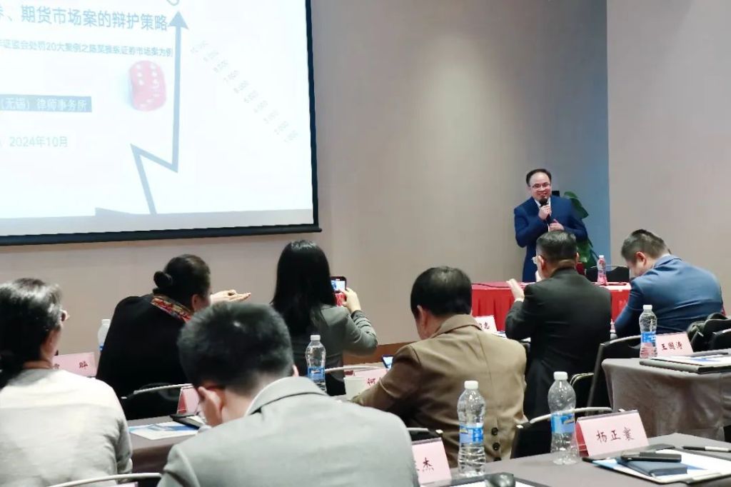 3. 操纵证券、期货市场案件的辩护策略:敬畏监管、恪守合规茶歇之后,联盛律师高级合伙人、刑事专业委员会主任、无锡律协刑委会主任王强律师以他办理的2021年证监会处罚20大案例之陈某操纵证券市场案为例,带来了关于证券市场操纵案件辩护策略的深入解析。他以丰富的实务经验为依托,详细讲解了市场操纵行为中的关键证据和操作手法,在当前“强监管、零容忍”的政策环境下,辩护律师需要具备全面的视角和专业的法律知识,以高度的敬业精神和责任心支持客户合法合规地应对挑战。他的分享为同行提供了宝贵的经验借鉴,帮助在场的律师和企业人员进一步理解如何在严密的监管中保护公司权益。