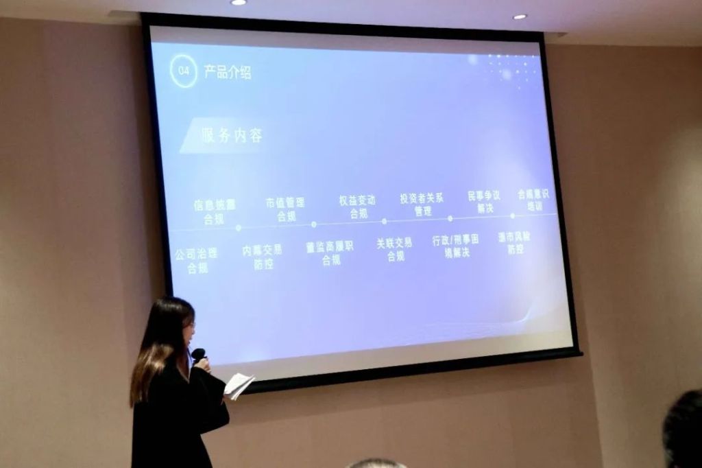 4. 合规产品发布:全方位保障上市公司合规运营活动气氛最为热烈的环节是由蔡钰雯主持的“上市公司证券合规法律服务”产品发布。她详细介绍了该产品覆盖的十二大合规领域,包括公司治理、信息披露、内幕交易防控、市值管理合规、董监高履职合规、权益变动合规、关联交易合规、投资者关系管理、行政/刑事困境解决、民事争议解决、退市风险防控、合规意识培训。产品通过风险识别、制度建设、咨询支持和危机应对等模块,为上市公司提供全流程支持,帮助企业建立稳健的合规体系,力求合规成为企业的护航者,而非成本负担。